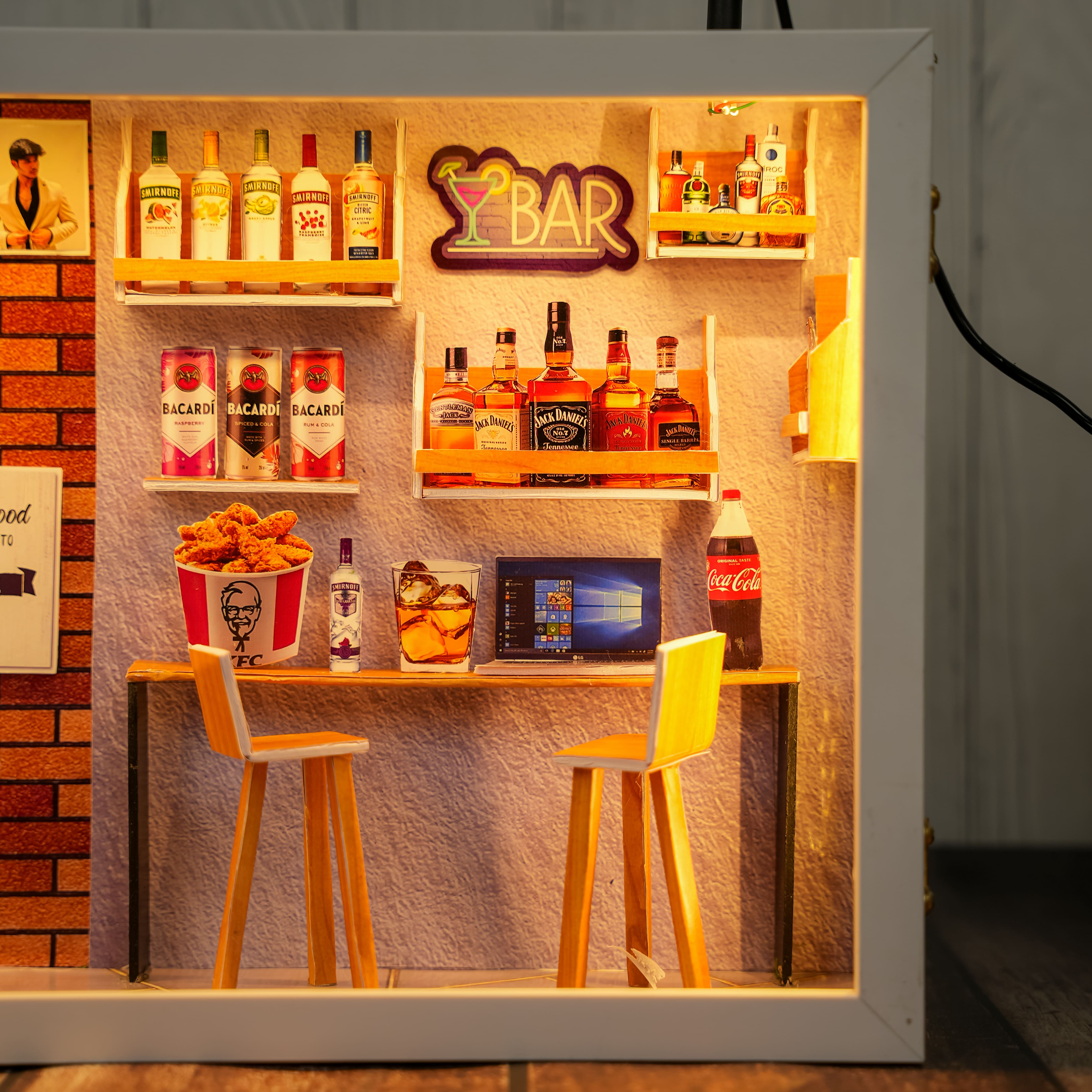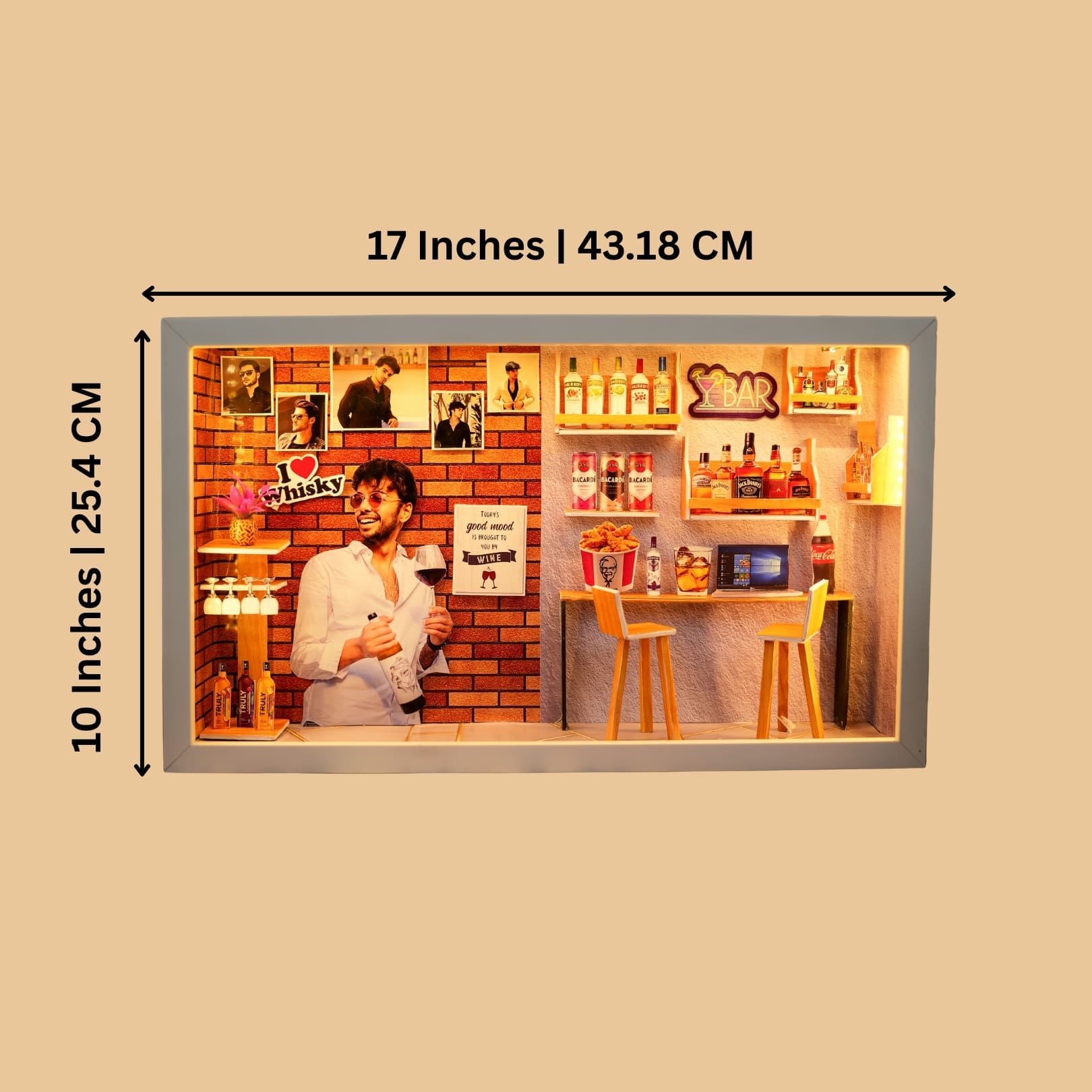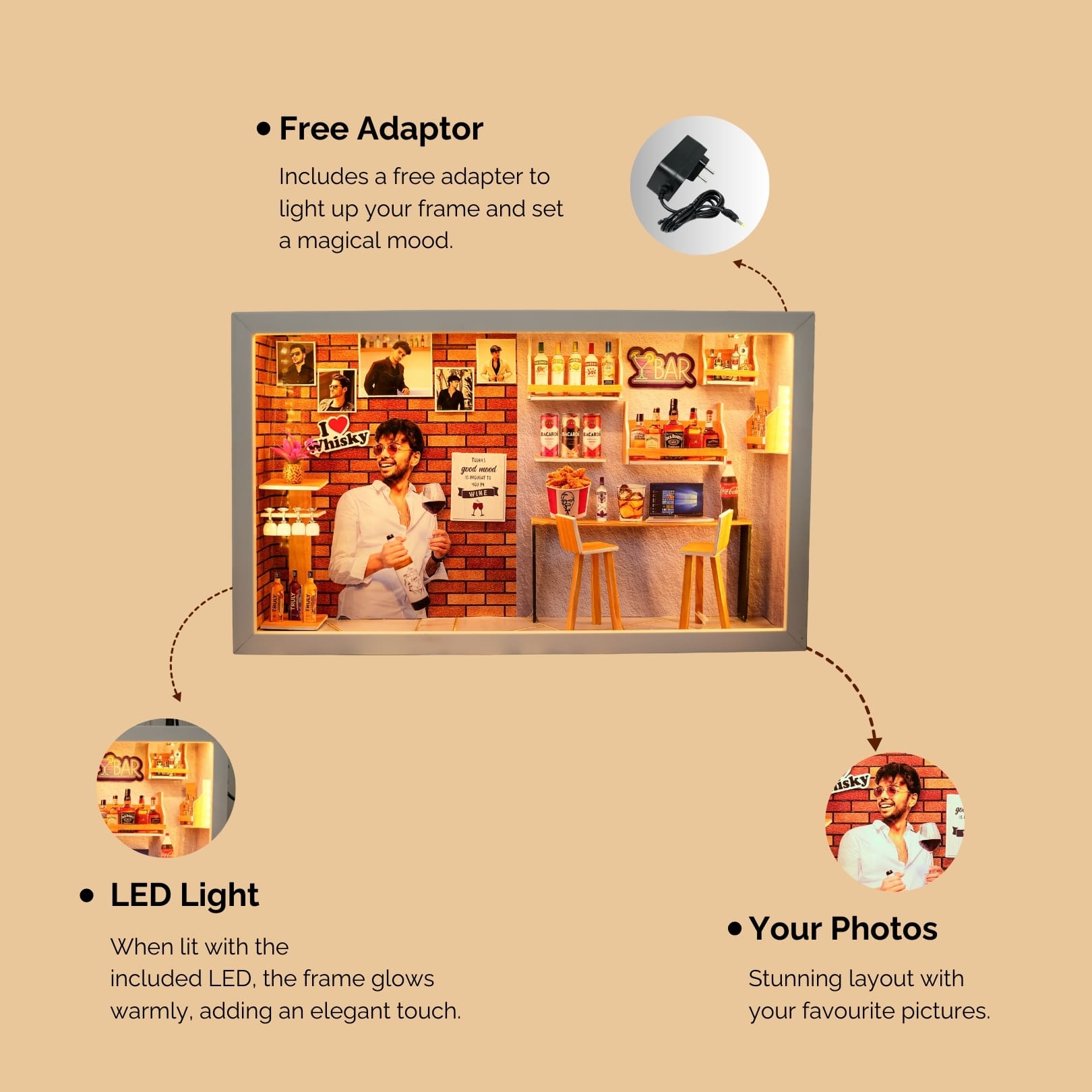 Got a friend who loves their drinks? The Party Lover Miniature Bar Frame is the perfect gift! This 17x10 inch frame is a mini bar scene, complete with whiskey and beer bottles, a bar counter, and two chairs. It's got a fun vibe, with five smaller pictures in the background and one big main picture front and center. Plus, it lights up with LEDs to set the mood! We'll even throw in a free adapter, so it's ready to plug and party!