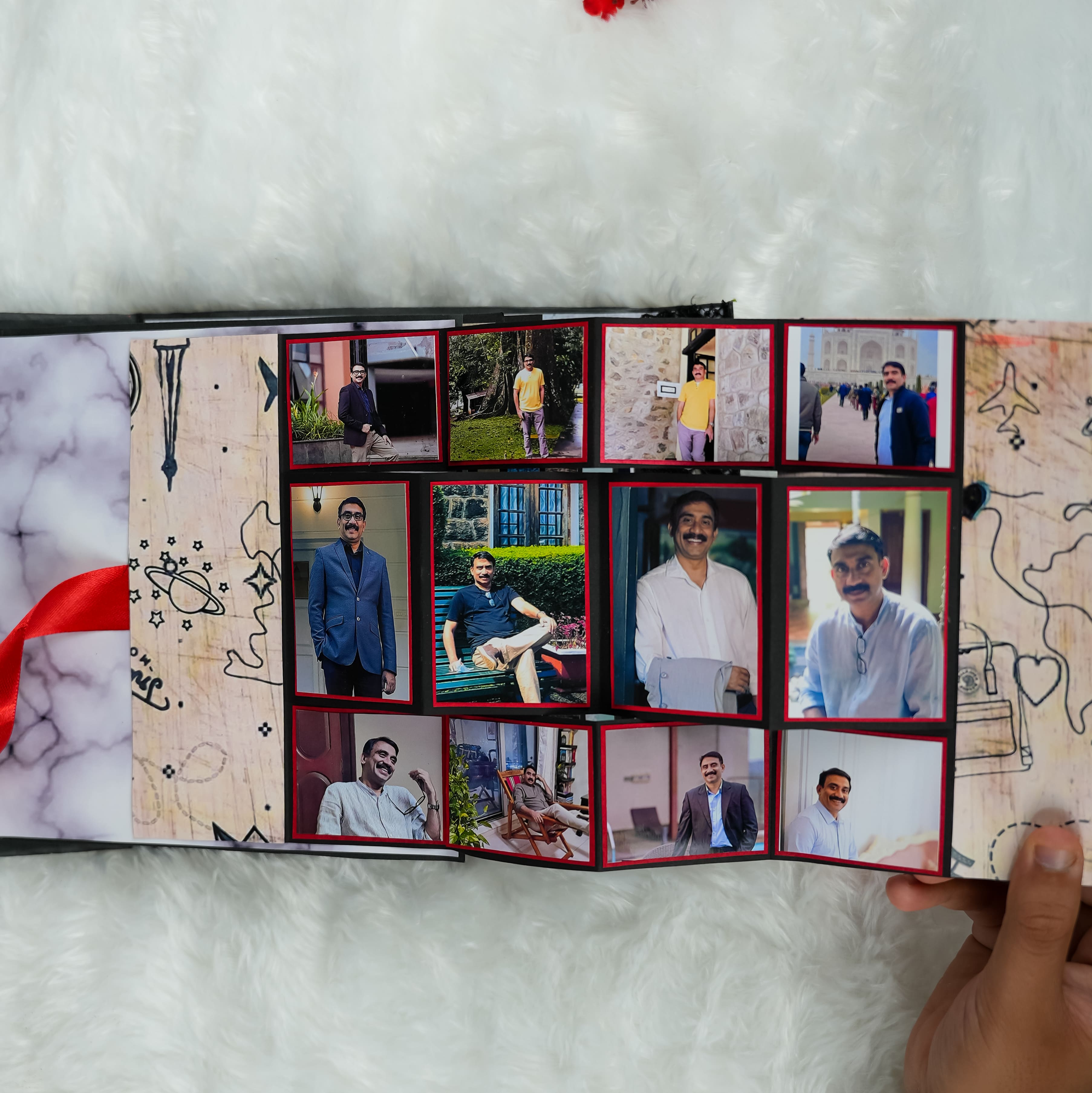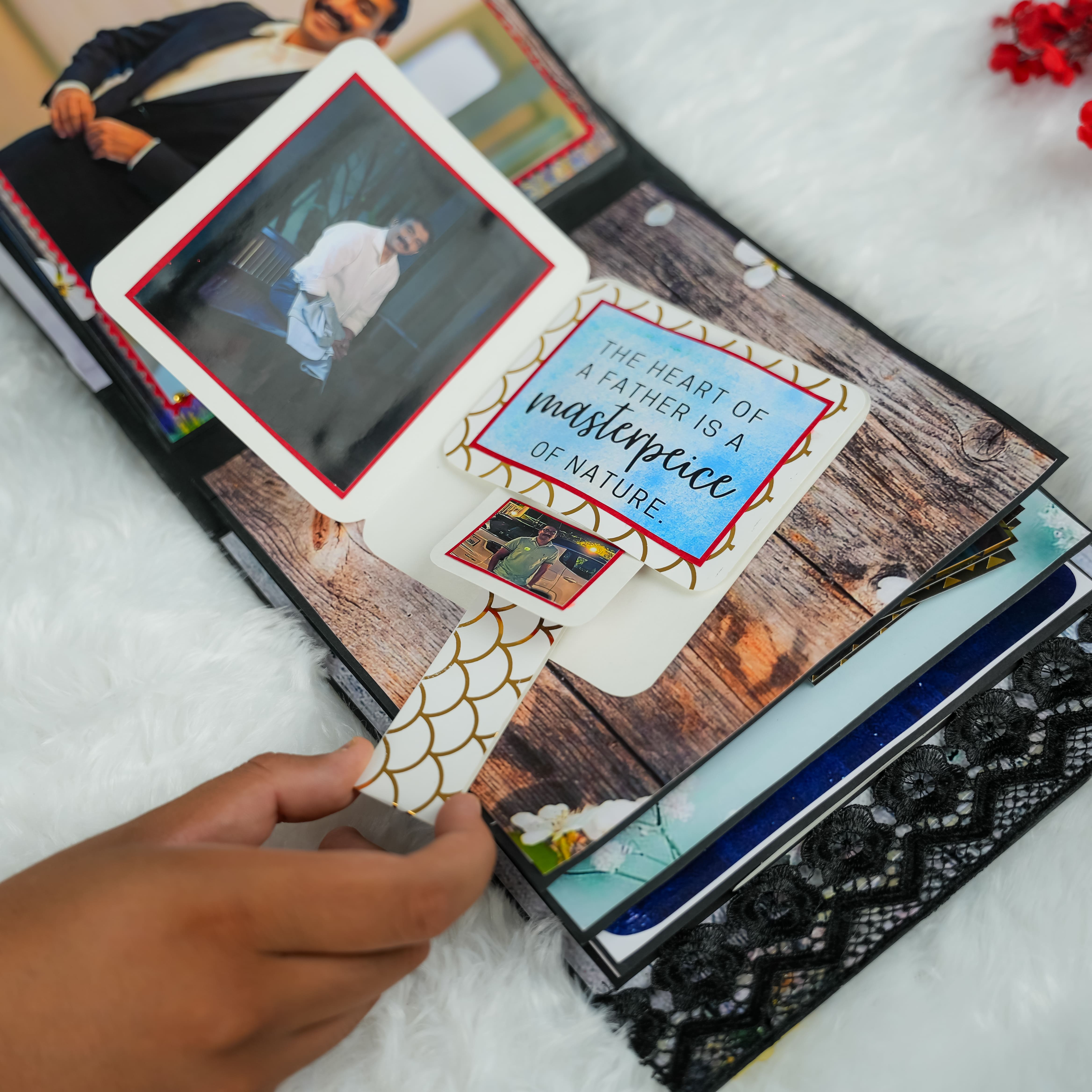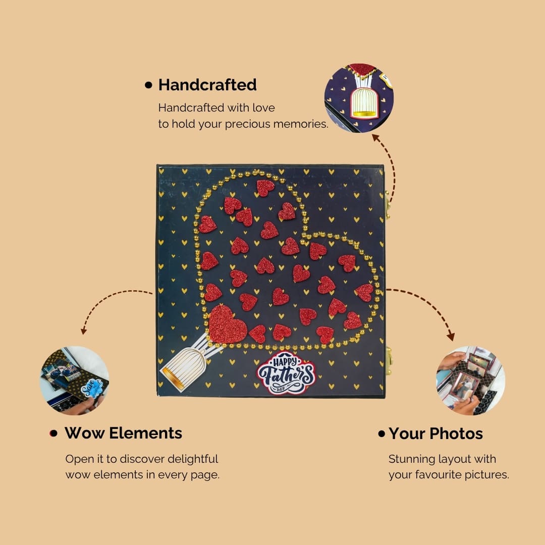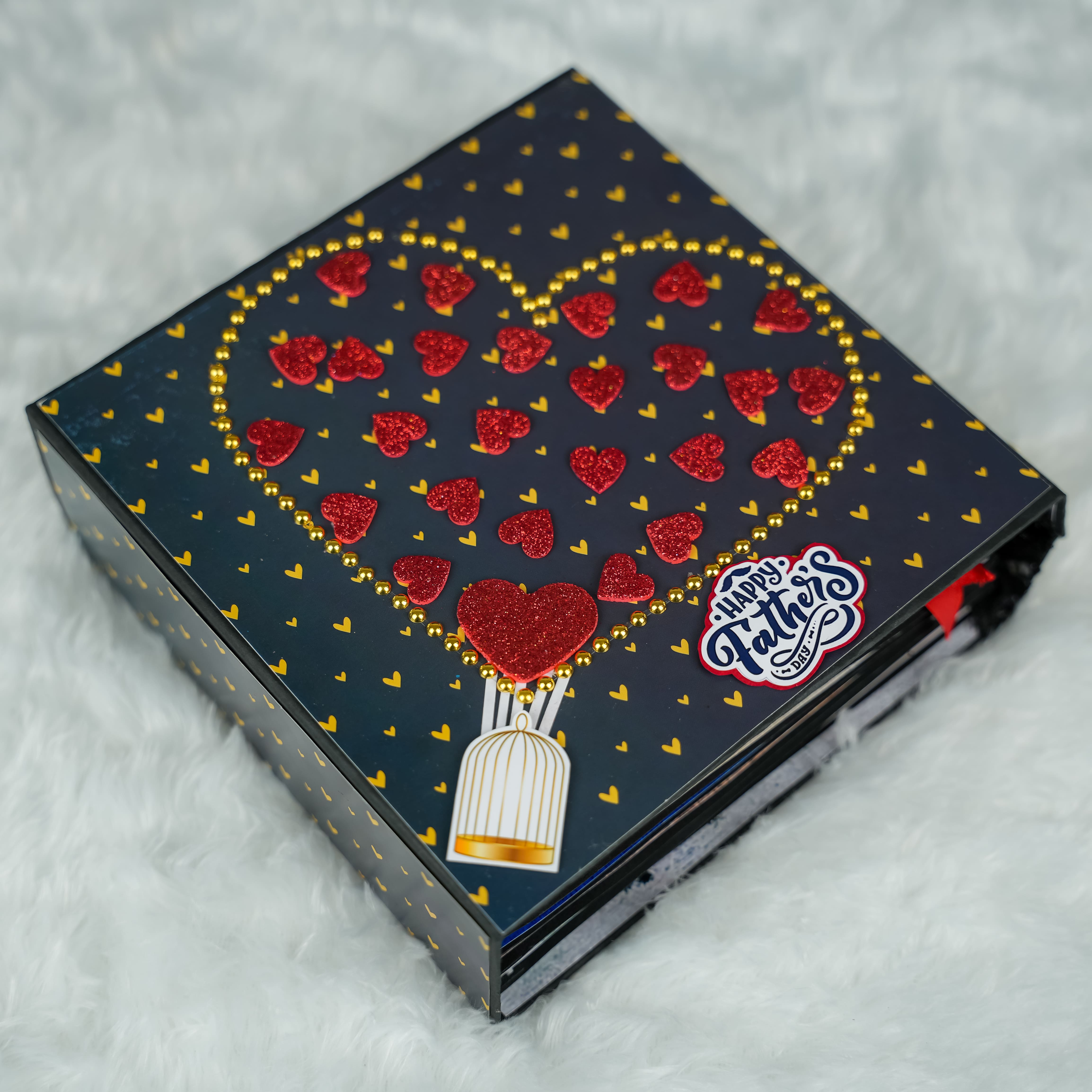 Make this Father's Day truly special with our best-selling personalized album! This charming album is available in three convenient sizes: 7x7 inches (perfect for 25 photos), 8x8 inches (holding 30 photos), and 9x9 inches (accommodating 35 photos). Each page is thoughtfully designed with cute elements that will delight any dad. The front cover is beautifully adorned with a unique combination of golden beads and shimmering red glitter hearts, making it an eye-catching and heartfelt gift. It's the perfect way to compile cherished memories and messages for the special father figure in your life.