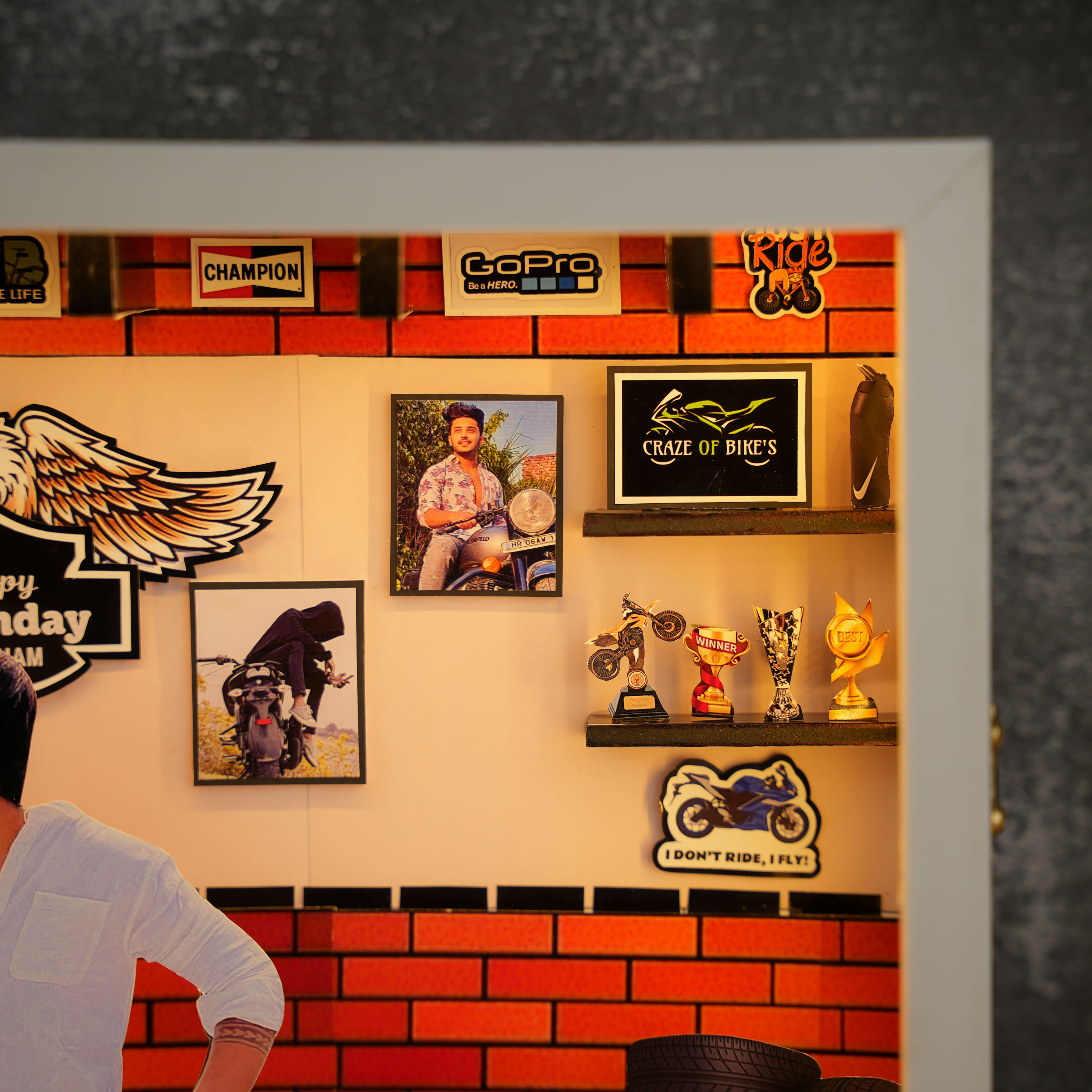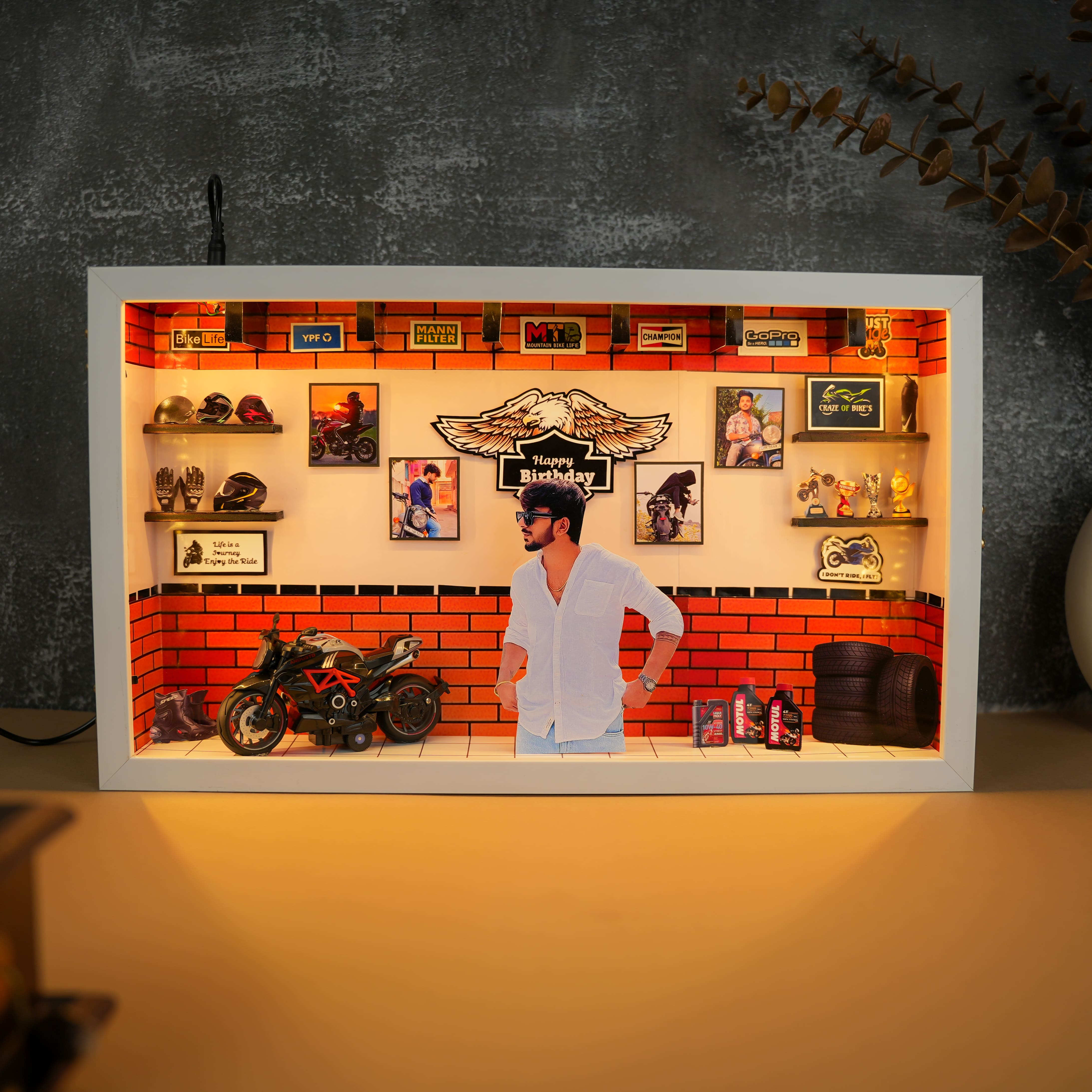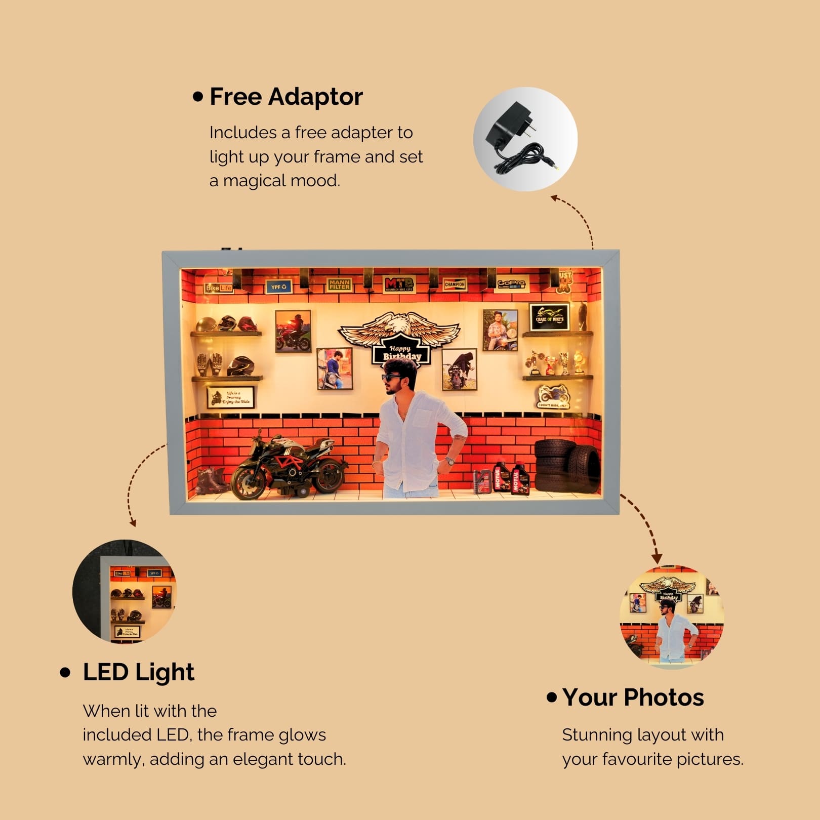 Know a bike fanatic? This cool 17x10 inch LED miniature frame is the perfect gift! It's got a fun garage vibe with a little bike model, tires, and oil cans. Plus, you can add 4 of their favorite photos in the background and one big one in the middle. It even lights up with built-in LEDs (adapter included!). They can put it on a shelf or hang it up. It's a super thoughtful birthday present for anyone who loves bikes!