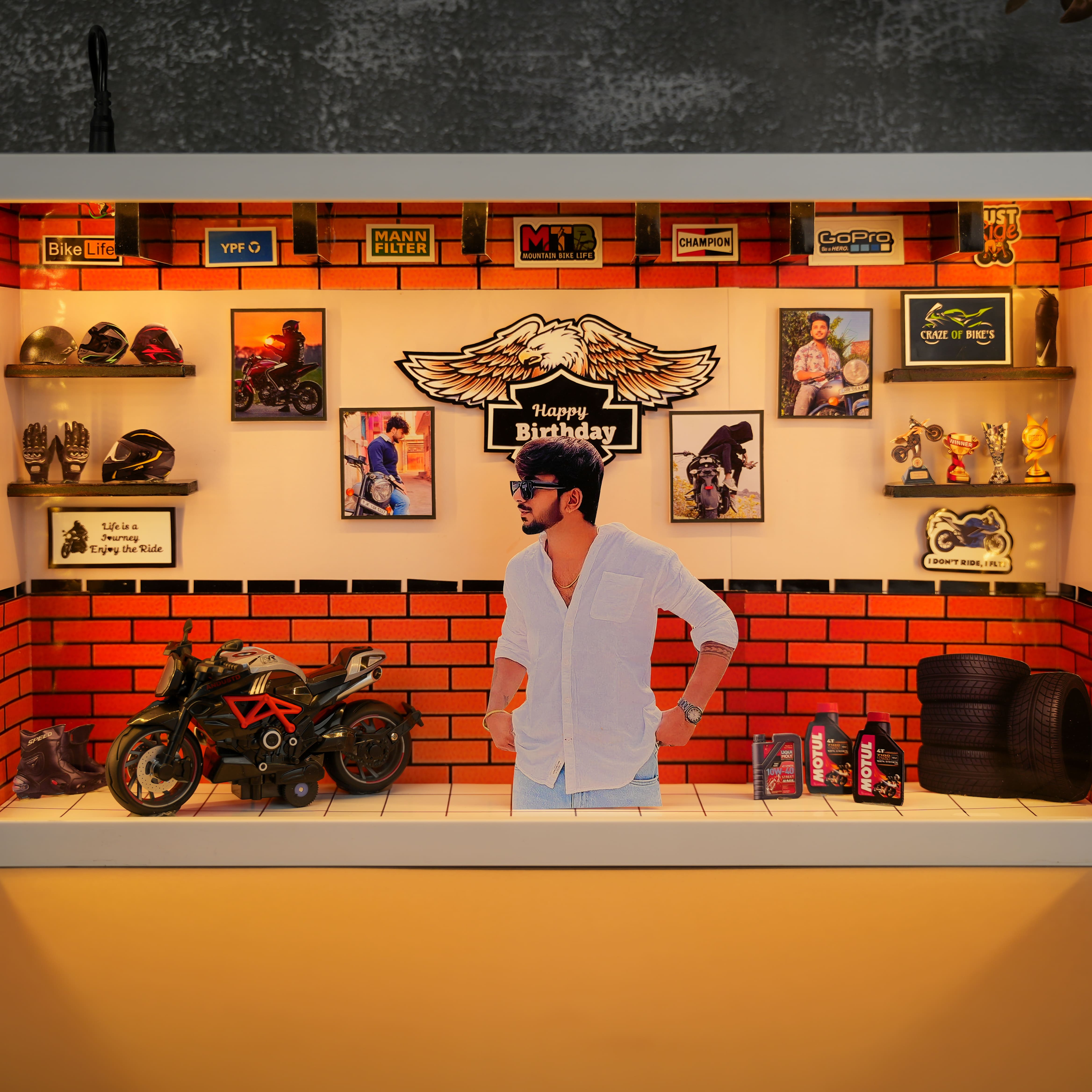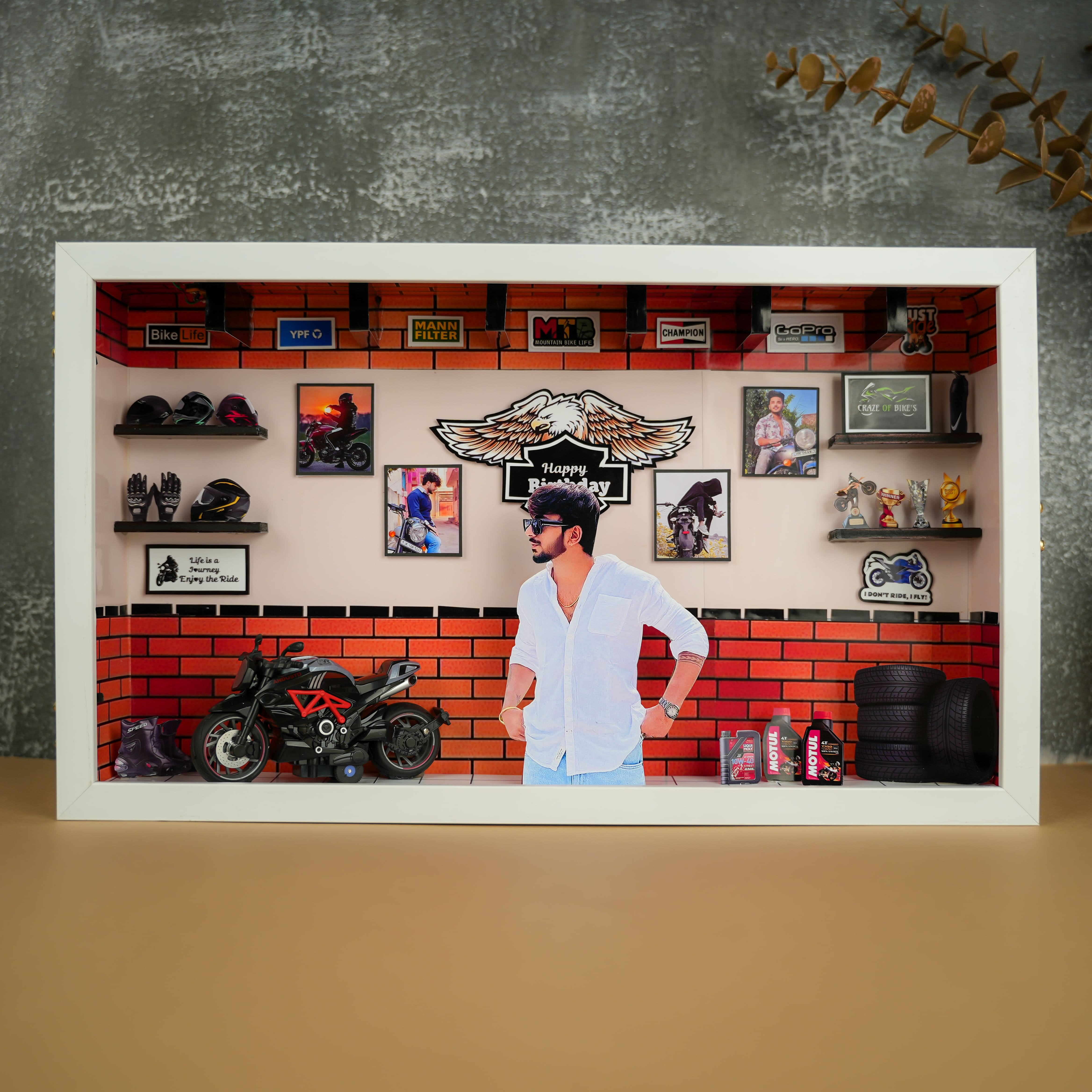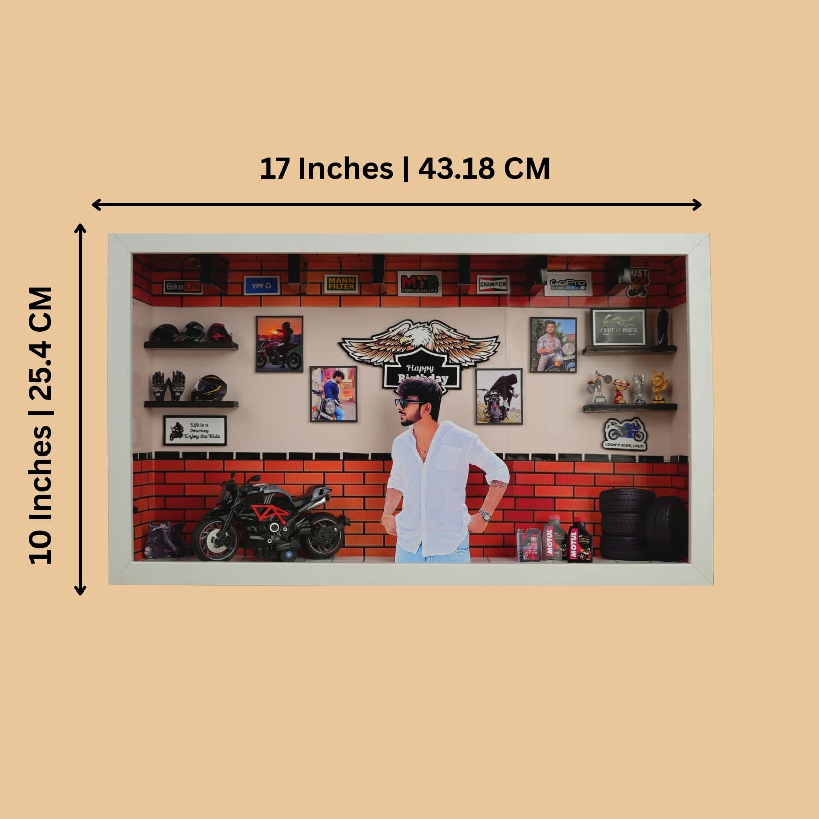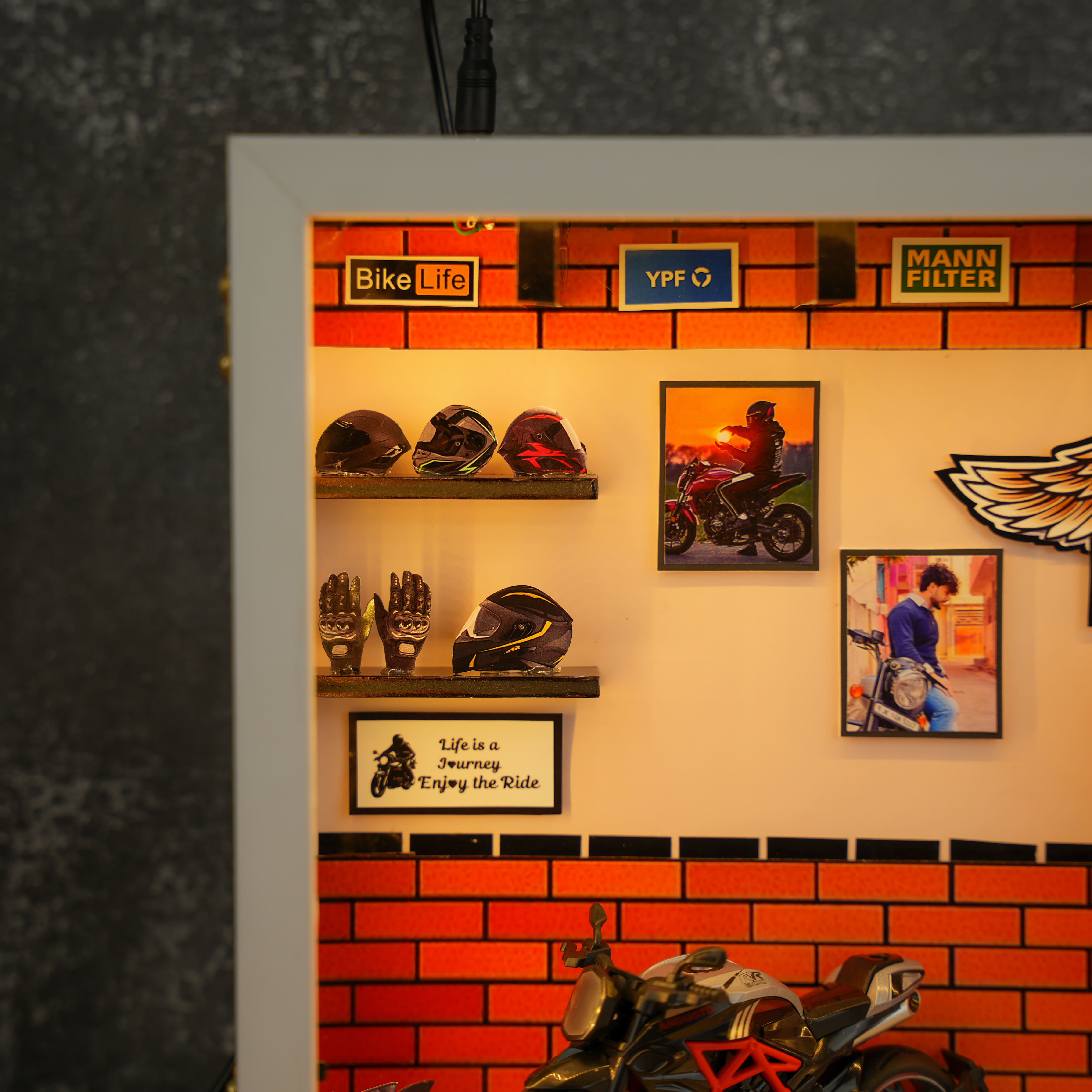 Know a bike fanatic? This cool 17x10 inch LED miniature frame is the perfect gift! It's got a fun garage vibe with a little bike model, tires, and oil cans. Plus, you can add 4 of their favorite photos in the background and one big one in the middle. It even lights up with built-in LEDs (adapter included!). They can put it on a shelf or hang it up. It's a super thoughtful birthday present for anyone who loves bikes!