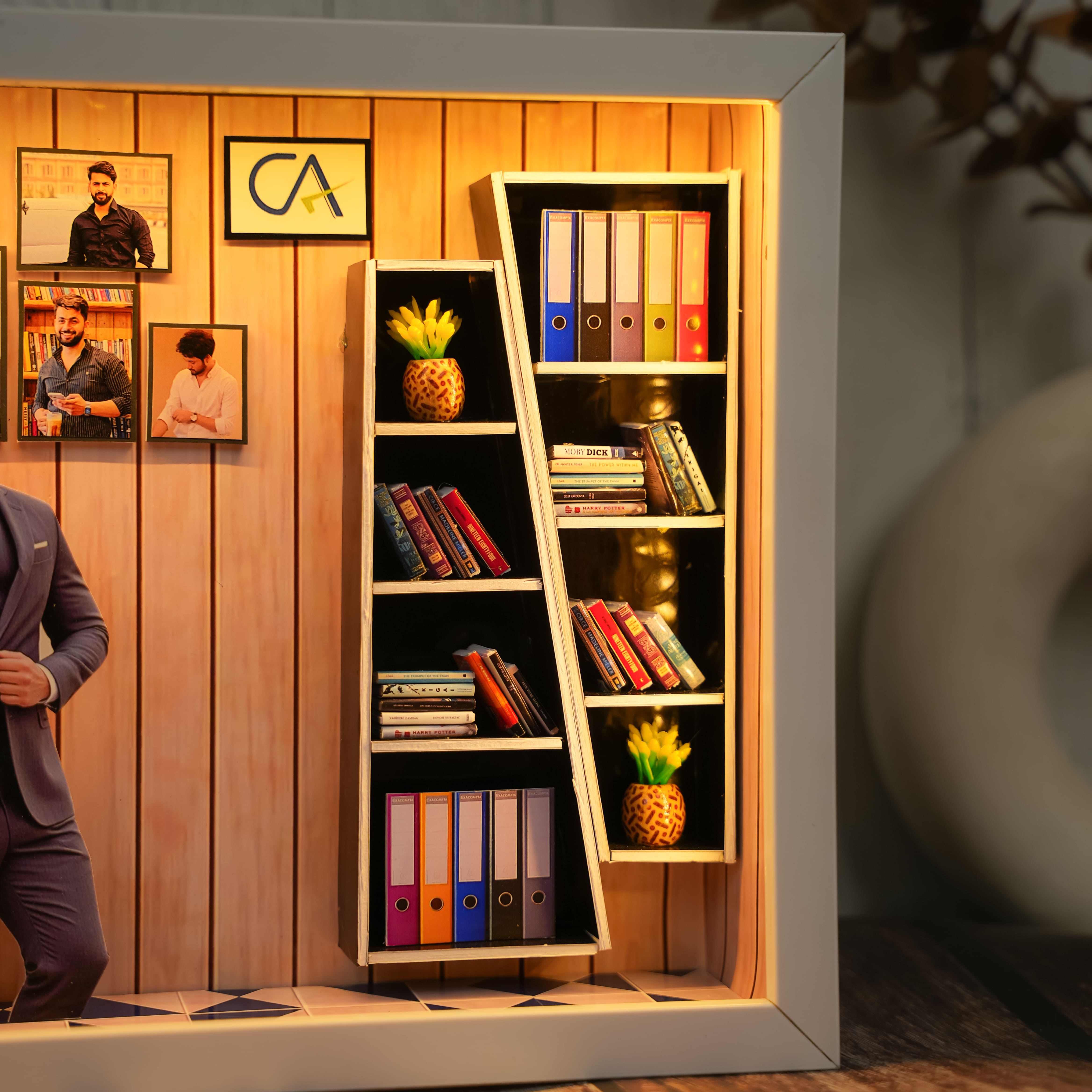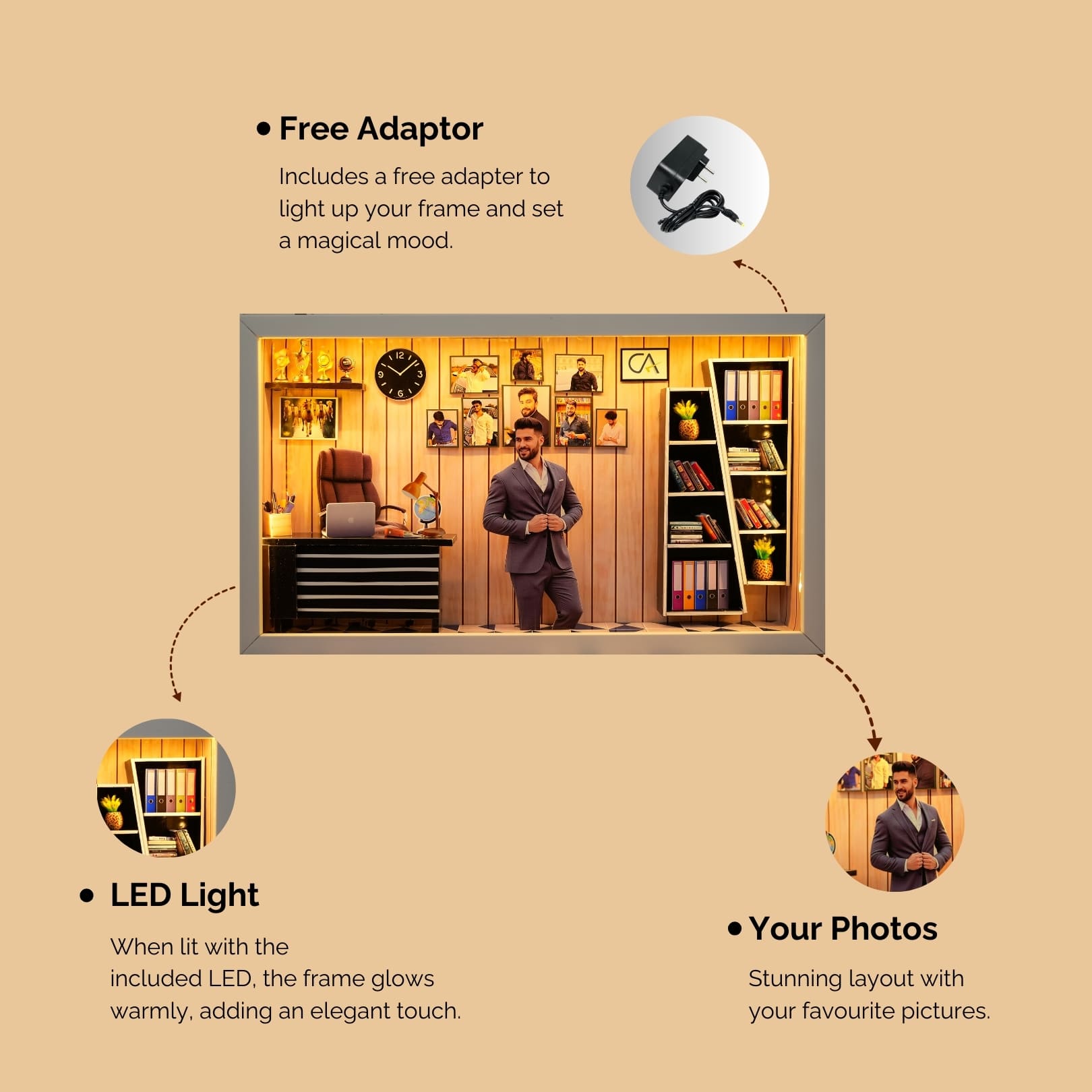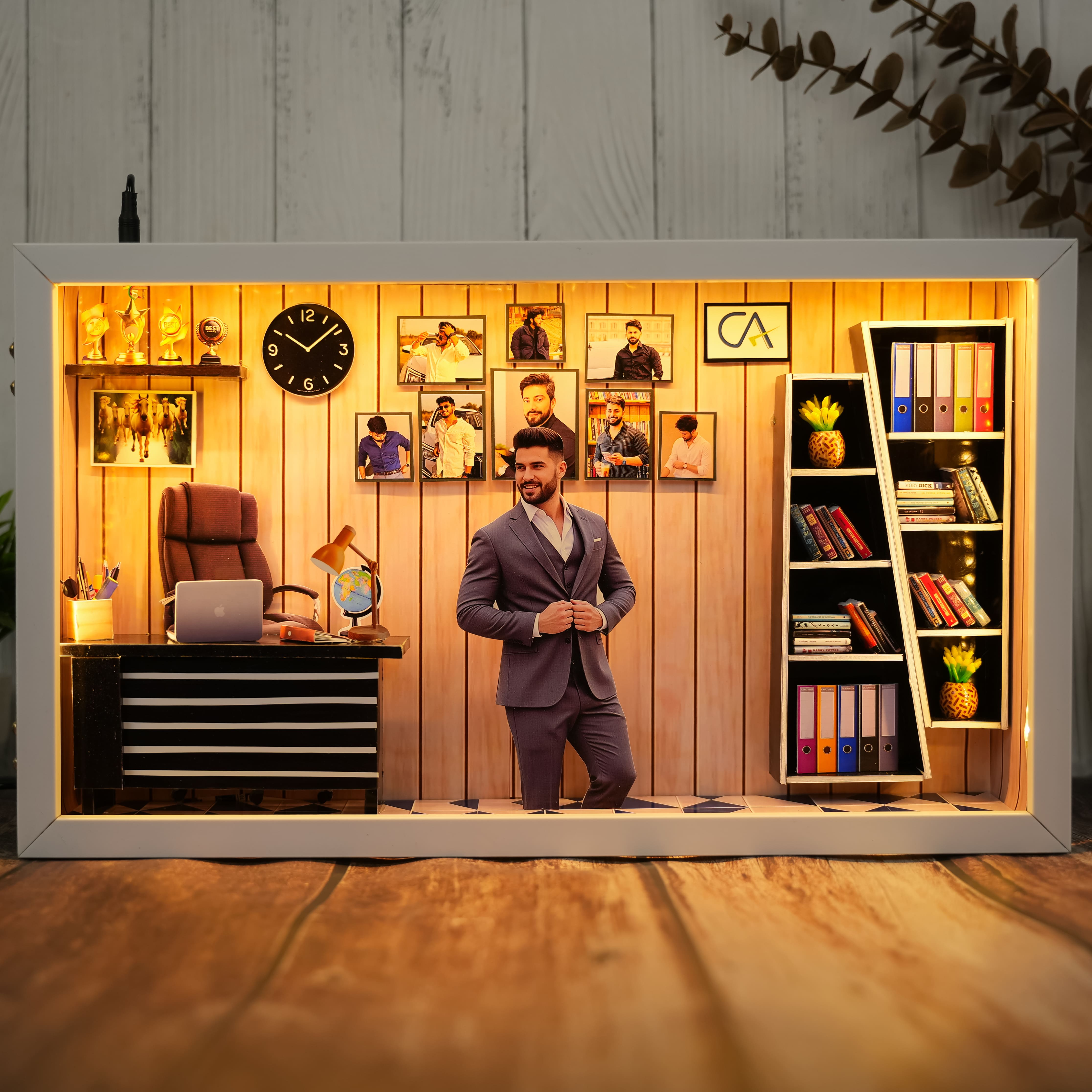 Want to make your desk a little more fun? Check out the "My Office Happy Place" frame! It's a 17x10 inch mini office scene that lights up with LEDs. Imagine a tiny desk, laptop, files and a complete office setup! We'll give you the adapter, so it's ready to shine. Perfect for anyone who spends time at a desk, or as a cool office gift!