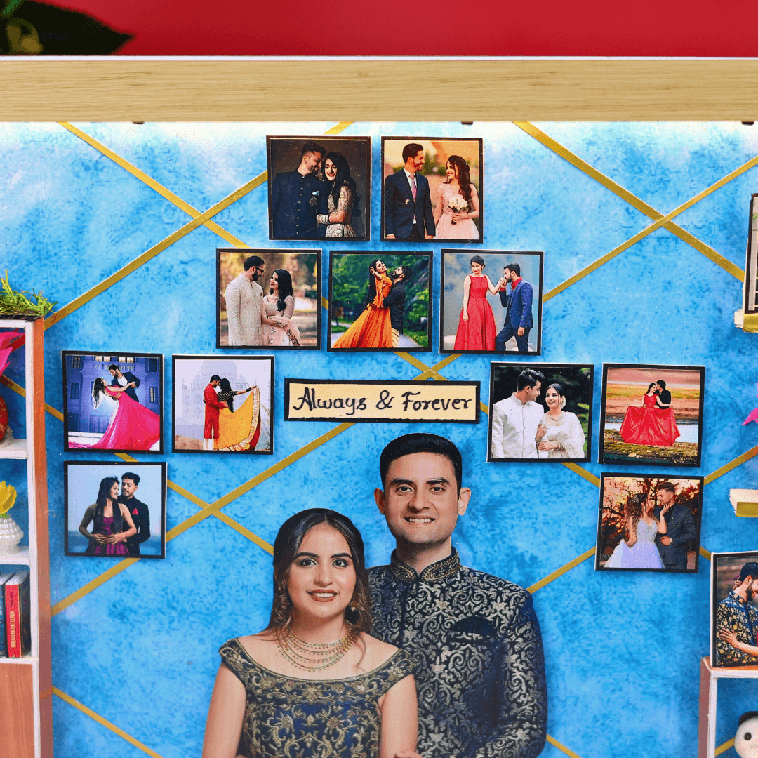 Featuring a stunning layout with a large main picture at the center, making it a unique and meaningful addition to your home decor. The miniature is adorned with sixteen additional photos, this frame beautifully captures cherished memory. And when illuminated with the included LED light connection, this frame exudes a warm and inviting glow that enhances its elegance. Plus, we've got you covered with a free adapter, making it easy for you to light up your frame and create a magical ambiance.